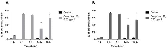 Compounds 10 and 22 caused increased membrane permeabilization on Lactobacillus plantarum. Both compounds caused membrane damage, which reflected in increased cellular fluorescence of SYTOX green (SG). The ratio of SG-positive cells was expressed in percent. (A) Membrane-permeabilizing effect of compound 10; (B) Membrane-permeabilizing effect of compound 22.