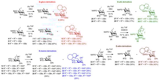 In the case of d-manno and d-altro configurations, the amidinium salts were formed with moderate yields (21, 22, 23, 24; 37, 38, 28–42%), while in the case of the d-allo configured saccharides, the nucleophilic substitution products (29, 30) were obtained in particularly high (63–76%) yields. In the case of the d-allo derivative (31), using DABCO as the reagent, the quaternary ammonium salt (32) was formed exclusively (yield 86%), which could be explained by the greater nucleophilicity of DABCO relative to DBU.