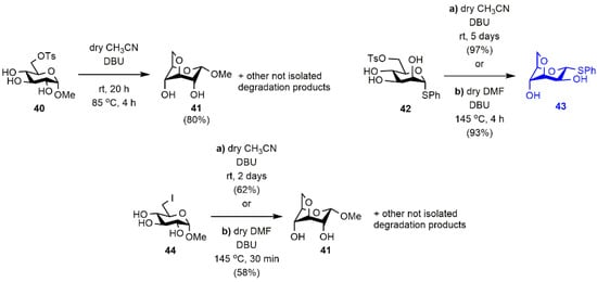 Since we also wanted to investigate the biological effect of the free amidinium salts, we attempted their direct production based on literature examples [23,35], by rapid synthesis without the use of protecting groups (Scheme 3). For this rapid synthetic method, we first synthesized the 6-O-tosyl derivative of methyl α-d-glucopyranoside (40) [36,37], then reacted this compound with DBU in dry acetonitrile. Neither the expected DBU-conjugated derivative nor the 5,6-eliminated derivative was formed in the reaction. The 3,6-anhydro derivative of the methyl α-d-glucopyranoside (41) [38] was identified as the main product, which was formed in excellent yield (80%). We also attempted to prepare the unprotected derivative from the 6-OTs derivative of phenyl 1-thio-α-d-mannopyranoside (42) [39,40]. We tested two types of reaction conditions (a, CH3CN + DBU and b, DMF + DBU), but unfortunately neither of the reactions produced the expected product. However, similar to the previous reaction, the 3,6-anhydro derivative of phenylthio-mannoside (43) was formed with excellent yield (97%). Finally, we attempted to carry out the reaction from the 6-iodo derivative of methyl α-d-glucopyranoside (44) [41], but these reactions did not lead to results either: here again, the 3,6-anhydro derivative (41) was formed along with other unidentified decomposition products. Based on these failed experiments, it can be concluded that the planned DBU-conjugated derivatives cannot be produced directly from the free derivatives under the conditions tested. Protection of the -OH groups of the carbohydrate part is essential for successful nucleophilic substitution reactions.
