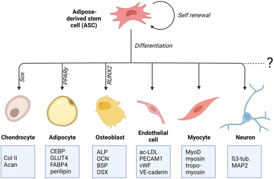 Figure 1. Differentiation potential of adipose-derived stem cells (ASCs): ASCs are multipotent mesenchymal stem cells that can be isolated from adipose tissue. ASCs can differentiate into mesenchymal cell lines such as osteocytes, adipocytes, and chondrocytes. There is also evidence for their differentiating potential into non-mesenchymal cell lines, such as endothelial cells, neuronal cells, and cardiac and skeletal myocytes. For each differentiation lineage, a specific “master transcriptional regulator” is identified. For adipogenic lineage it is PPARγ, for osteogenic lineage it is RUNX2, and for chondrogenic lineage it is Sox9. Lineage-specific differentiation can be determined by specific proteins that are listed in the boxes (created with BioRender.com).