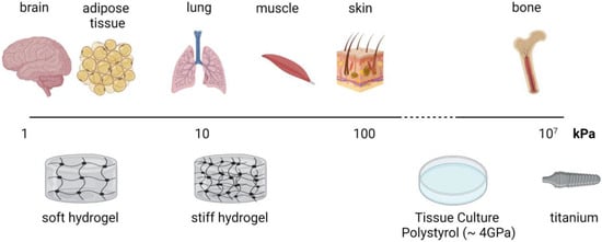 Figure 3. Overview of the stiffness of different tissue and common cell culture and implant materials (created with BioRender.com).