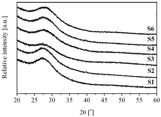 The X-ray diffraction scans measured for the tellurite glasses are shown in Figure 1. The obtained results confirmed the amorphous structure of all tested tellurite glass samples. Only wide convexities (amorphous halo) in the XRD images in 2θ range between 25 and 35 degrees, characteristic of the amorphous phase, are noticeable.