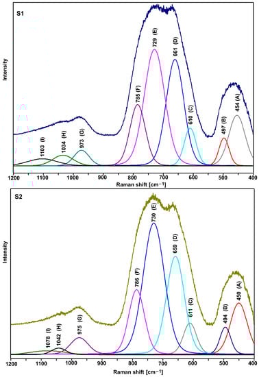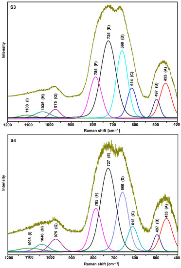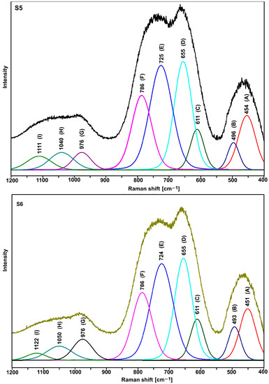 As compared with the other spectra, a slightly different shape of the S5 and S6 spectra (the relation of the intensity of the bands in the range of 600–900 cm−1) indicates an additional role of titanium ions. However, due to the large half-width of the bands (amorphous materials), it is not easy to precisely interpret the spectra in question. Therefore, it was necessary to decompose them into component bands (Figure 5, Figure 6 and Figure 7, Table 3 and Table 4).
