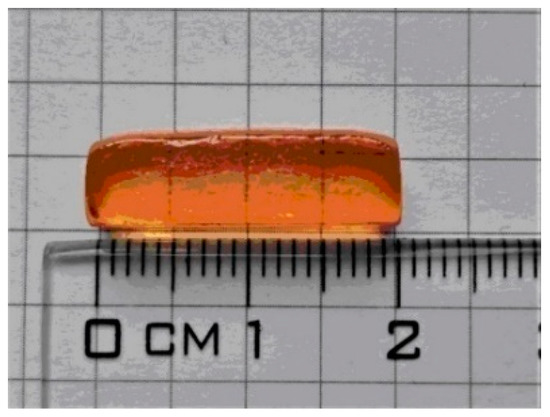 Melted 5 g sets of tellurite glasses (70TeO2-5XO-10P2O5-10ZnO-5PbF2, where X = Pb, Bi, Ti) were poured into a brass mold at a temperature of 330 °C. The samples were annealed at 320–340 °C for 2 h to remove any stresses developed in the material. Before starting the tests, the obtained glasses were carefully machined to form samples with geometrical parameters required for the measurement methods used. The nominal compositions of investigated glasses are summarized in Table 5. An example of tellurite glass after machining is shown in Figure 9. The sample is cylindrical in shape.