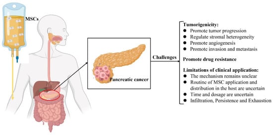 Despite the therapeutic potential of MSCs in several diseases, their applications in the treatment of cancer are still controversial. Although MSCs have been found to promote tumor initiation and progression, emerging research has indicated the beneficial effects of MSCs in cancer therapy [17,25,26,27]. In this review, we aimed to focus on the potential anti-cancer treatment prospects of the MSC-based approach and summarize current challenges in the clinical application of MSCs for treating pancreatic cancer.