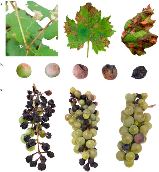 Black rot symptoms on different organs. (a) From the left: shoot internode, greenhouse and field leaves. Foliar lesions showed the typical circular shape, with a light brown to reddish color and rounded and darker borders. In the field, the co-occurrence of downy mildew (dark brown lesions) was evident. (b) Disease progression on the berry: after the appearance of a small dot, the lesion expanded concentrically, rapidly producing pycnidia; later, the berry dried up, turning into black mummy. (c) Clusters showing different degrees of resistance, from the left: very low (1), medium (5), high (7) (for resistance descriptors see M&M 4.2).