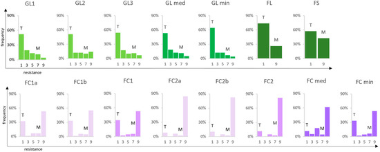 Phenotypic distribution within the M × T population (n = 147). The black rot resistance trait did not follow a normal distribution in any of the experiments (Shapiro–Wilk p < 0.05). Both greenhouse (GL1, GL2, GL3, GL median and minimum) and field (FL, FS) shoot evaluations were skewed towards susceptibility, while cluster resistance trials (FC1, FC2, FC median and minimum) and sub-experiments (FC1a and b, FC2a and b) were skewed towards resistance. On the y axis the frequency of F1 individuals is shown, while the x axis indicates the degree of resistance: 1 = very low; 3 = low; 5 = medium; 7 = high; 9 = very high (for resistance descriptors see M&M 4.2). Abbreviations: FC = field cluster; FL = field leaf; FS = field shoot internode; GL = greenhouse leaf; M = ‘Merzling’; T = ‘Teroldego’.