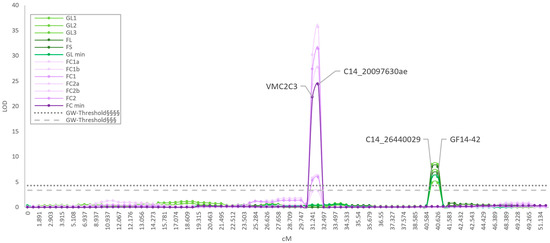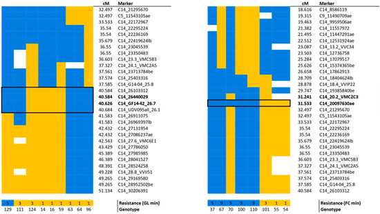 The QTL associated with shoot resistance was located between 40.584 and 40.626 cM (two-LOD support interval). The associated marker GF14-42 (40.626 cM) explained from a minimum of 20.4% (GL2) to a maximum of 29.2% (GL1) of the phenotypic variability, and it coincided with the marker segregating with Resistance to Guignardia bidwellii (Rgb)1 locus [21]. The second marker C14_26440029 (40.584 cM) segregated with the QTL with the same LOD and PVE as GF14-42 (Figure 4, Table 2).