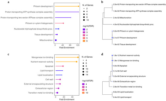 Gene Ontology (GO) enrichment and hierarchical clustering trees summarize the correlation among significant gene sets for Rgb1 (panel a,b) and Rgb3 (panel c,d) loci, respectively. Enriched categories (panel a,b) are colored based on false discovery rate (FDR, −log10 transformed). On the left, bigger dots indicate increased number of genes, while on the right side they indicate more significant p-values.