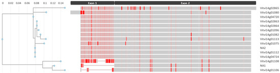 By blasting the sequence of Vitvi14g01075 Glp3 on PN40024.v4, five more genes were identified within the cluster, bringing the total number of genes to 15 (Figure S4), whose structural annotation, hence, underwent manual curation. In two cases (Vitvi14g01106 and Vitvi14g02865, V3 annotation), the genes erroneously unify two open reading frames (ORFs). These were split, resulting in two new genes annotated in the PN40024 version 4.3 (V4.3) [37] as Vitvi14g04724 and Vitvi14g04720, which corresponded to VIT_14s0006g02400 and VIT_14s0006g02440 in the CRIBI version 1 annotation (V1) [38]. In addition, two new genes were annotated starting at position 19,604,399 (gene name nota available 1, NA1) and 19,612,558 (gene name NA2), which are in progress to be approved by the curators of PN40024.v4. The manual curation was supported only by the non-PN40024 RNAseq evidence, except for one gene (Vitvi14g01096) supported by PN40024 RNA-Seq data. Instead, four ORFs showed no supporting expression data (Table S9). The multiple alignment of the amino acid (aa) sequences revealed a very high mean identity of 94.3%, and the three sequences NA2, Vitvi14g01112, and Vitvi14g04724 and the two sequences Vitvi14g02863 and Vitvi14g02864 were identical within each other (Figure 7 and Figure S4). Conversely, the lowest identity value (79.5%) was obtained by the pairwise alignment between Vitvi14g01108 and Vitvi14g02865 (Figure S4). The alignment showed a greater identity of the second exon, while the region of increased variability was in the first exon. In particular, 10 genes shared a predicted protein length of 221 aa, while the genes NA1, Vitvi14g01106, and Vitvi14g01108 showed gaps in the first exon, and the genes Vitvi14g01080 presented an extra upstream sequence (13 aa), and the gene Vitvi14g02865 an extra downstream (7 aa) sequence (Figure 7 and Figure S4).
