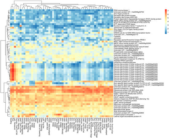 Transcriptomic analysis of Rgb3 locus genes in different tissues and developmental stages using the VITVIZ ‘Corvina’ ATLAS [39]. Blue and red colors represent low and high expression levels, respectively (logarithmic data transformation).