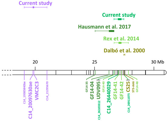 Overview of the black rot resistance QTLs at chromosome 14. The map is an integration between the current and the previous [21,40,42] studies, based on marker position (Mb) on PN40024.v4 [35]. The box plots represent QTL intervals based on co-segregating markers (larger font) expanded (error bars) to the nearest non-associated flanking markers (smaller font). The Rgb3 associated to bunch resistance detected in the current study is depicted in purple. The Rgb1 locus associated with leaf resistance in the current and previous works [21,40,42] are colored with different shades of green. The same color code is given for the respective markers. The overlap of the analyses is highlighted in grey. Official names are shown for SSR markers, for the original names of SNP markers see Table S11.
