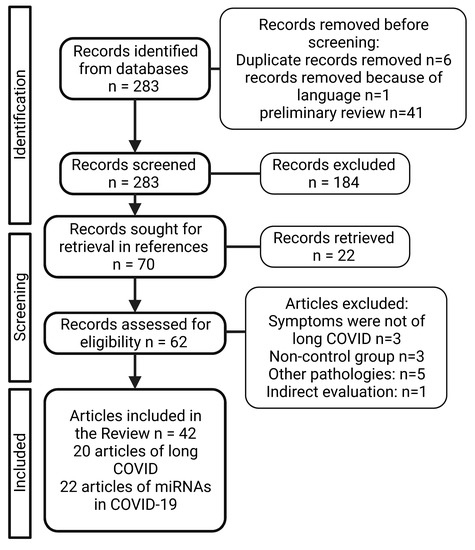 APA StyleReyes-Long, S., Cortés-Altamirano, J. L., Bandala, C., Avendaño-Ortiz, K., Bonilla-Jaime, H., Bueno-Nava, A., Ávila-Luna, A., Sánchez-Aparicio, P., Clavijo-Cornejo, D., Dotor-LLerena, A. L., Cabrera-Ruiz, E., & Alfaro-Rodríguez, A. (2023). Role of the MicroRNAs in the Pathogenic Mechanism of Painful Symptoms in Long COVID: Systematic Review. International Journal of Molecular Sciences, 24(4), 3574. https://doi.org/10.3390/ijms24043574