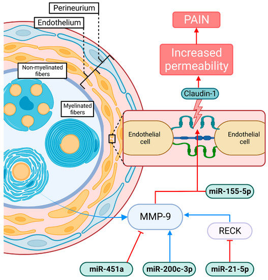 - Reinhold, A.K.; Krug, S.M.; Salvador, E.; Sauer, R.S.; Karl-Schöller, F.; Malcangio, M.; Sommer, C.; Rittner, H.L. MicroRNA-21-5p Functions via RECK/MMP9 as a Proalgesic Regulator of the Blood Nerve Barrier in Nerve Injury. Ann. NY Acad. Sci. 2022, 1515, 184–195. [Google Scholar] [CrossRef]