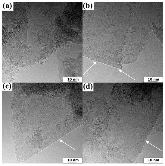 Representative HRTEM images of obtained samples: (a) GF_Na_600 sample, (b) GF_Na_700 sample, (c) GF_Na_800 sample, and (d) GF_Na_900 sample, (white arrows on the image (b–d) showing pure and thin sheets).