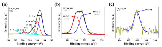 High-resolution X-ray photoelectron spectra for C1s, O1s, and N1s of representative sample: (a) C1s of GF_Na_800, (b) O1s of GF_Na_800, and (c) N1s of GF_Na_800.