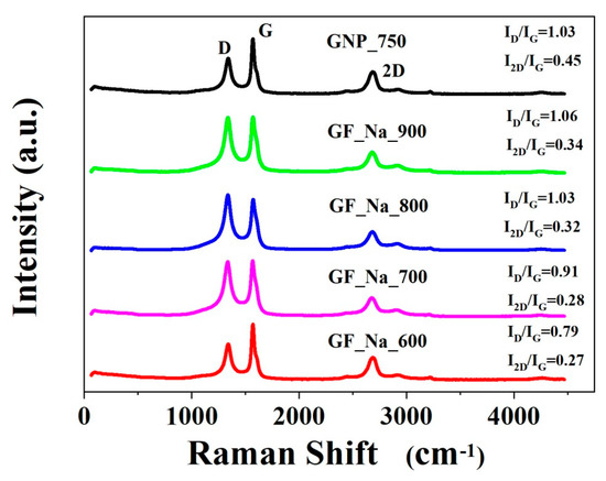 The intensity ratios I2D/IG and ID/IG prove that the investigated samples contain mainly multilayered graphene. The carbonization temperature of the presented samples affects the position of the G and 2D bands. The GF_Na_900 sample had more vacancies and disorders since it had the highest ID/IG ratio and moreover the highest carbon at.%.