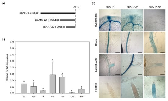 Promoter analysis and expression of AtSAH7 in different developmental stages. (a) Schematic presentation of pSAH7 deletions. (b) Promoter analysis of AtSAH7 in 6-day-old seedlings. pSAH7 fragments were transcriptionally fused to the GUS reporter gene and displayed different expression patterns. Bar 100 μm. (c) Relative expression analysis of AtSAH7 in different developmental stages. Tissues examined: 3d: 3-day-old seedlings; 10d: 10-day-old seedlings; R: root; Cot: cotyledons; Sh: Shoots; Lvs: rosette leaves and Flw: flowers. Values ± SD were normalized to the mean of UBQ10 and represent the mean of three biological samples analyzed in triplicate. Significant differences at p ≤ 0.05 are indicated by letters a, b.