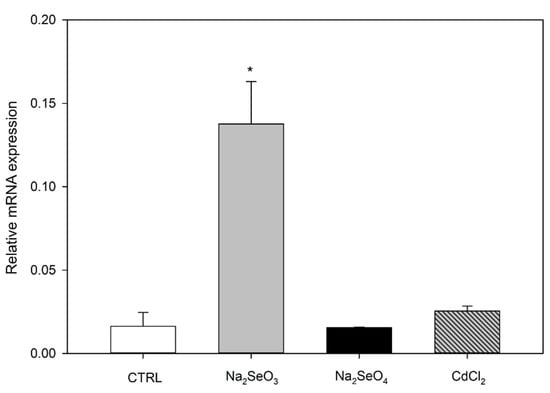 Relative expression levels of AtSAH7 in Arabidopsis thaliana roots treated with selenium compounds (selenite, Na2SeO3; selenate, Na2SeO4) and cadmium (CdCl2). Significant upregulation of AtSAH7 was observed after selenite (Na2SeO3) treatment. Values ± SD were normalized to the mean of UBQ10 and represent the mean of three biological samples analyzed in triplicate. Significant differences at p ≤ 0.05 are indicated by asterisks.