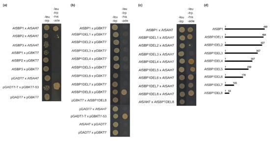 Yeast two-hybrid assay. (a) AtSAH7 in vivo interactions with AtSBPs. AtSAH7 interacts only with AtSBP1. (b–d) AtSBP1 deletions examined for physical interaction with AtSAH7. (b) Controls used for the deletion analysis. (c) Interaction analysis of AtSBP1DELs with AtSAH7. (d) Schematic presentation of AtSBP1 truncations used. The first 53aa are important for the aforementioned interaction. To exclude false positives proper controls were used, including pGADT7 × pGBKT7 as a negative control and pGADT7-T × pGBKT7-53 as a positive control.