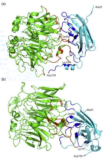 - Jumper, J.; Evans, R.; Pritzel, A.; Green, T.; Figurnov, M.; Ronneberger, O.; Tunyasuvunakool, K.; Bates, R.; Žídek, A.; Potapenko, A.; et al. Highly Accurate Protein Structure Prediction with AlphaFold. Nature 2021, 596, 583–589. [Google Scholar] [CrossRef]