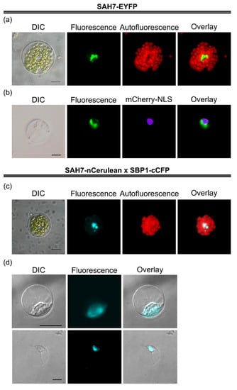 These findings are in line with our results from protoplast isolation and transfection. Protoplasts were isolated from stable mCherry-NLS Arabidopsis plants from mesophyll and roots. In both cases, protoplasts were transiently transfected with pSAT6/35S-AtSAH7-EYFP. The signal observed in the fluorescent microscope was similar to a horseshoe that surrounds the nucleus (see Section 2.6).
