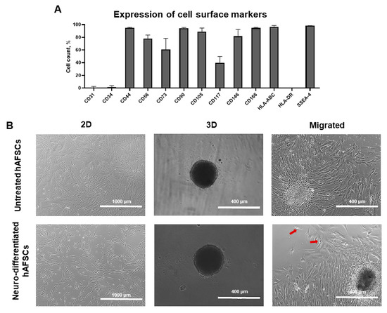 Morphological and cell surface marker characterization of hAFSCs grown in 2D and 3D cell cultures. (A) Flow cytometric cell surface marker expression analysis of CD31, CD34, CD44, CD56, CD73, CD90, CD105, CD117, CD146, CD166, HLA-ABC, and HLA-DR in control (untreated) hAFSCs, cultivated in 2D cell cultures. Data are shown as percentage (n = 3), and values are indicated as mean ± SD. (B) Morphology of control (untreated) and neuro-differentiated hAFSCs, grown in 2D and 3D (spheroid) cell cultures, and hAFSCs cells migrated from spheroids (representative images; scale bars: 1000 μm, 400 μm and 400 μm, respectively). Neurogenic differentiation was initiated using chemical cocktail consisting of 50 ng/mL BDNF + 100 ng/mL NGF + 5 mM KCl + 2 μM RA (representative image illustrating hAFSCs morphology in 2D after 24 h post differentiation induction). For spheroid formation, 10,000 hAFSCs were seeded to Nunclon Sphera 96-well plates. Spheroids were cultivated for 7 days. For hAFSCs migration from 3D cultures, spheroids, after 7 days of cultivation in Nunclon Sphera 96-well plates, were transferred to standard cell culture dishes and were left for 5 days to migrate. Red arrows denote cells that exhibited typical neural-like morphology.