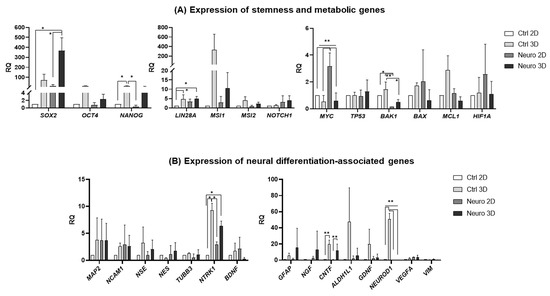 Gene expression profile of stemness, metabolic genes, and neuronal markers in control and induced to neural differentiation hAFSCs, grown in 2D and 3D cell cultures. RT-qPCR analysis of hAFSCs (A) stemness-associated genes SOX2, OCT4, NANOG, LIN28A, MSI1, MSI2, and NOTCH1 and cell survival-associated/metabolic genes MYC, TP53, BAK-1, BAX, MCL1, HIF1A, (B) as well as neural differentiation crucial genes MAP2, NCAM1, NSE, NES, TUBB3, NTRK1, BDNF, GFAP, NGF, CNTF, ALDH1L1, GDNF, NEUROD1, VEGF, and VIM. Gene expression analysis was performed using control hAFSCs (not treated, “Ctrl”) and neuronal differentiation-induced hAFSCs (treated for 5 days with 50 ng/mL BDNF + 100 ng/mL NGF + 5 mM KCl + 2 μM RA; denoted as “Neuro”). Control and neuro-induced hAFSCs were cultivated either in 2D or 3D cell cultures. RT-qPCR data are represented as relative fold change over 2D undifferentiated control, normalized for the housekeeping genes GAPDH and RPL13A; values are indicated as mean ± SD (n = 3). Note: * denotes significant difference with p < 0.05, ** denotes significant difference with p < 0.01, as evaluated using one-way repeated-measures ANOVA with Tukey‘s post hoc test.