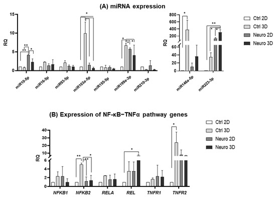 miRNA and gene expression profile of NF-κB–TNFα pathway genes in control (not treated, “Ctrl”) hAFSCs and hAFSCs induced to neural differentiation (“Neuro”; treated for 5 days with 50 ng/mL BDNF + 100 ng/mL NGF + 5 mM KCl + 2 μM RA; denoted as “Neuro”), grown in 2D and 3D cell cultures. (A) miRNA expression analysis of control hAFSCs and neuro-induced hAFSCs. Data are represented as relative fold change over 2D undifferentiated control, normalized for the endogenous control hsa-miR-423-5p; values are indicated as mean ± SD (n = 3). (B) Gene expression analysis of hAFSCs NF-κB–TNFα pathway-associated genes (NFKB1, NFKB2, RELA, REL, TNFR1 and TNFR2). Gene expression analysis was performed using control hAFSCs and neuronal differentiation-induced hAFSCs. RT-qPCR data are represented as relative fold change over 2D undifferentiated control, normalized for the housekeeping genes GAPDH and RPL13A; values are indicated as mean ± SD (n = 3). Note: * denotes significant difference with p < 0.05, ** denotes significant difference with p < 0.01, as evaluated using one-way repeated-measures ANOVA with Tukey‘s post hoc test.