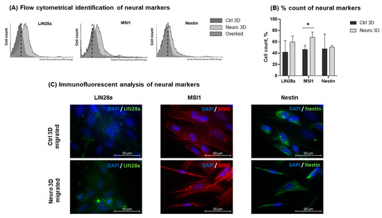 Next, we evaluated and compared protein expression of untreated and neuro-differentiated hAFSCs in 2D and 3D cultures. First, hAFSCs migrated from spheroids (after 5 days of reattachment and seeding to cell culture dishes) were examined with flow cytometry (Figure 4A,B). Results demonstrated that neural induction with 50 ng/mL BDNF + 100 ng/mL NGF + 5 mM KCl + 2 μM RA in 3D spheroid cultures upregulated the quantity of hAFSCs positive for Lin28a and MSI1 (only a negligible increase in Nestin protein expression was detected). The most significant increase (p < 0.05) was observed in MSI1+ cells (from 47% in untreated 3D cultures to up to 68% in neuro-differentiated 3D cultures). The flow cytometry analysis results were confirmed by immunofluorescent evaluation of LIN28a, MSI1, and Nestin expression in control and neuro-induced hAFSCs migrated from 3D spheroids (Figure 4C).