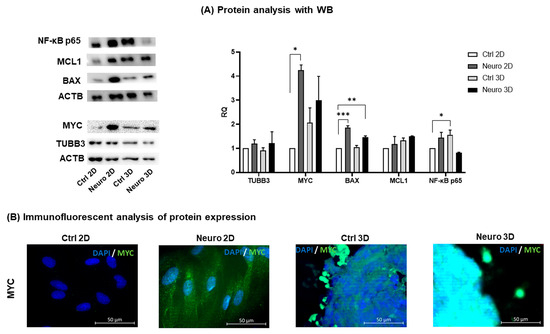 Augmentation in expression of pro-apoptotic proteins MYC and BAX in neuro-differentiated hAFSCs (2D cultures and spheroids) was confirmed with Western blot and immunofluorescence techniques (Figure 5A,B). Surprisingly, MYC expression was detected not only in nucleus but also in cytoplasm of 2D neuro-induced hAFSCs (see Supplementary Figure S1). In addition, the results of protein analysis coincided with the data of gene expression (Figure 2A), as MYC and BAX protein levels were higher in 2D rather than in 3D neuro-induced cells. Contrary, expression of anti-apoptotic MCL1 protein increased at a comparable degree in both 2D and 3D neuro-induced hAFSCs, as well as in untreated 3D spheroids. Similarly to the mRNA levels of TUBB3 (Figure 2B), no differences were detected in the protein quantities of TUBB3, either in untreated or induced to neural differentiation hAFSCs, when grown in 2D or 3D cell cultures. Although no significant differences in RELA gene expression was detected either in untreated 3D, or neuro-induced 2D and 3D hAFSCs cultures, Western blot analysis revealed that the levels of NFκB p65 subunit were upregulated in neuro-differentiated 2D (up to 1.45-fold, n. s.) and untreated 3D hAFSCs (up to 1.6-fold, p = 0.05). These results indicate that neural differentiation and three-dimensional spheroid formation in hAFSCs are accompanied by the modulation of pro-survival and apoptotic pathways.
