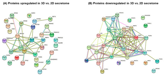 Proteins identified in hAFSCs secretome. (A) Identified proteins that were upregulated in 3D vs. 2D hAFSCs secretome. (B) Identified proteins that were downregulated in 3D vs. 2D hAFSCs secretome. Association networks of proteins were studied and represented using STRING database (http://string.embl.de, accessed on 13 July 2021).