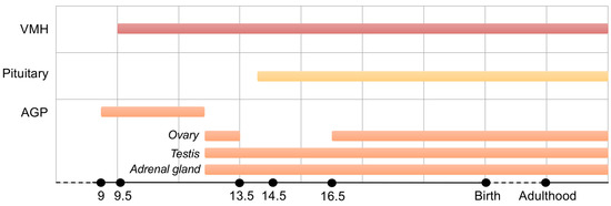 Spatial and temporal profiling of Nr5a1 transcripts in mice has revealed their presence as early as embryonic day (E) 9 in the adrenogonadal primordium (AGP), the common structure from which the adrenal gland and the gonads are derived [26,27,28]. In humans, NR5A1 transcripts are first detected in the urogenital ridge at 32 days post-ovulation (dpo)/Carnegie stage (CS) 14 [29], before adrenal and gonadal differentiation. In both species, SF-1 expression precedes that of the testis-determining SRY [6,29].