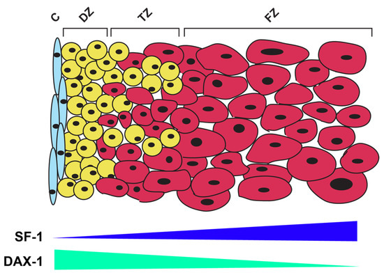 These properties of SF-1 may also have an important role during human adrenal development: it has been reported, in fact, that higher levels of SF-1 are expressed in the FZ compared with the DZ [47], which correlates to the suppression of genes involved in the production of cortisol [15] and to the reduced expression of DZ marker genes (NOV/CCN3) induced by an increased dosage of SF-1 in the H295R cell model [108]. It is then tempting to speculate that changes in SF-1 expression and/or activity have an important role in the modulation of adrenocortical cell differentiation towards a FZ vs. DZ phenotype. Interestingly, the expression pattern of the DAX-1 repressor in the fetal adrenal is the opposite of SF-1, with higher expression and more pronounced nuclear localization in the DZ compared with the FZ [113]. In this model, lower SF-1 activity in the DZ would allow for progenitor cell maintenance and subsequent differentiation into cells of the definitive cortex, while higher SF-1 activity in the FZ is associated with their androgenic steroid secretion pattern (Figure 4).