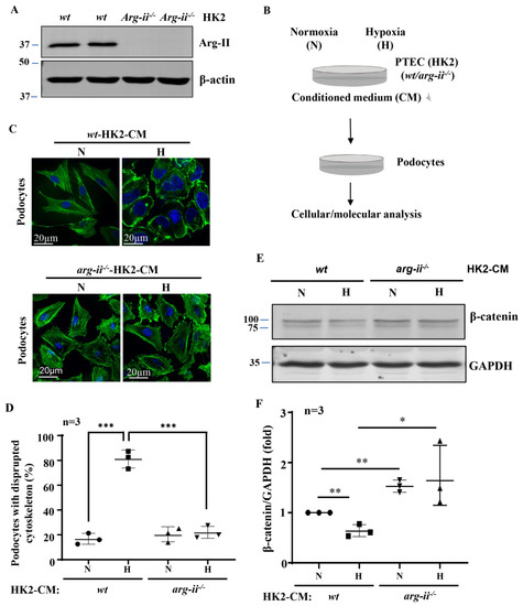 Generation of the arg-ii knockout human proximal epithelial cell line, arg-ii−/−-HK2, by CRISPR/Cas9 was confirmed by immunoblotting (Figure 1A). Conditioned media (CM) from wt-HK2-cells and arg-ii−/−-HK2 exposed to normoxia or hypoxia for 48 h were then collected and transferred to the differentiated podocytes (Figure 1B). Differentiated podocytes treated with normoxic wt-HK2-CM for 24 h displayed long, parallel, and organized cytoskeleton filament fibers (Figure 1C), whereas podocytes treated with hypoxic wt-HK2-CM for the same time period exhibited significant cytoskeleton filament reorganization. The cytoskeleton fiber organization pattern became shortened and disrupted, and the percentage of cells with cytoskeleton fiber disruption was increased (Figure 1C,D). This change in podocyte cytoskeleton filament reorganization or disruption was prevented when the arg-ii gene was knocked out in the HK2 cells (Figure 1C,D). β-catenin, which has been reported to be closely associated with cellular cytoskeleton actin organization [30,31], was significantly decreased in the podocytes treated with hypoxic wt-HK2-CM, which was prevented with arg-ii−/− in HK2 cells (Figure 1E,F).
