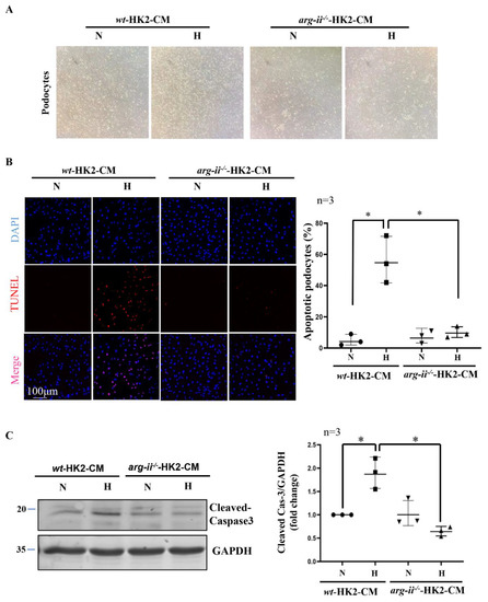 Further experiments showed that hypoxic wt-HK2-CM but not arg-ii−/−-HK2-CM, causes cellular rounding in the morphology of podocytes in culture (Figure 2A). In addition, TUNEL staining reveals podocyte apoptosis induced by hypoxic wt-HK2-CM, which was not observed with arg-ii−/−-HK2-CM (Figure 2B). In accordance, the levels of cleaved-caspase-3 associated with cellular apoptosis were increased in podocytes treated with hypoxic wt-HK2-CM but not arg-ii−/−-HK2-CM (Figure 2C). These results suggest a paracrine factor(s) released from HK2 cells, causing podocyte apoptosis, which is dependent on Arg-II in the HK2 epithelial cells.