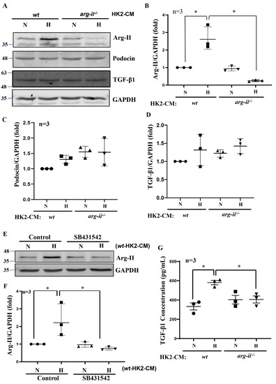 Hypoxic HK2 enhances Arg-II levels in podocytes through TGF-β1. Experiments were performed as described in Figure 1, and podocyte lysates were prepared and subjected to (A) Immunoblotting analysis of the protein levels of Arg-II, podocin, and TGF-β1; GAPDH serves as the loading control. The quantification of the signals is presented as graphs in (B–D). (E) Podocytes were treated with wt-HK2-CM in the absence or presence of SB431542: a TGF-β1 receptor 1 inhibitor. (F) Quantification of Arg-II signal in (E). (G) Quantification of the concentration of TGF-β1 in HK2-CM measured by ELISA. * p < 0.05 between the indicated groups. n = 3; CM: conditioned media, N: normoxia, H: hypoxia.