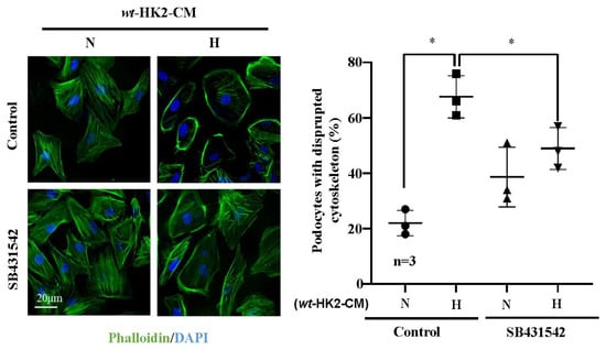 Hypoxic HK2 enhances cytoskeleton filament derangement in podocytes through TGF-β1. Experiments were performed as described in Figure 3E and subjected to Phalloidin staining of cytoskeletal actin fibers (green) in human podocytes. Nuclei were stained with DAPI (blue). Quantification of the podocytes with disrupted actin cytoskeleton (in percentage) is presented in the graph on the right. * p < 0.05 between the indicated groups. n = 3; CM: conditioned media, N: normoxia, H: hypoxia. SB431542: TGF-β1 receptor 1 inhibitor.