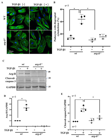 Arg-ii knockout in podocytes prevents TGF-β1-induced podocyte cytoskeleton disorganization and apoptosis. Podocytes were treated with or without TGF-β1 (10 ng/mL) for 48 h and subjected then to (A) phalloidin staining of cytoskeletal actin fibers (green). The nucleus were stained with DAPI (blue). (B) Quantification of podocytes with disrupted actin cytoskeleton is presented in the graph. (C) Immunoblotting analysis of the protein levels of Arg-II and cleaved-caspase 3 in different groups of podocytes as indicated; GAPDH serves as the loading control. (D,E) Graphs showing quantification of the signals of Arg-II and cleaved-caspase 3, respectively. * p < 0.05 between the indicated groups. n = 3.