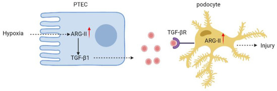 It is of note that crosstalk among podocytes and other cell types in the kidney has been demonstrated in the literature. For example, during CKD progression, vascular endothelial growth factor (VEGF)-A/C and angiopoietin-1 are secreted by podocytes, which results in glomerular endothelial cell dysfunction and albuminuria [39,40,41]. Moreover, podocyte–mesangial cell communication has also been reported. While podocyte injury promotes mesangial cell proliferation, mesangial cell injury also causes foot process fusion and proteinuria [42]. Factors derived from mesangial cells induce epithelial–mesenchymal transition (EMT) of podocytes, leading to glomerular injury [43]. In addition, it has been reported that extracellular vesicles are secreted from high glucose-treated podocytes to induce apoptosis of PTECs [44]. Vice versa, some humoral mediators released from proximal tubules are proposed to cause podocyte dysfunction [45]. However, research into the mechanism and implication of podocyte-PTEC crosstalk in the progression of podocytes and tubulointerstitial injury are not clear or limited. Our present study adds another piece of evidence demonstrating that hypoxic tubular cells play a role in podocyte damage through the paracrine release of TGF-β1, which is dependent on Arg-II.
