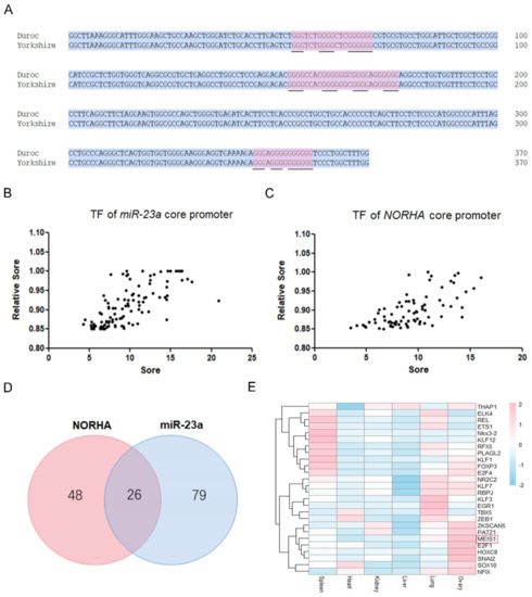 Characterization of the core promoters of the porcine miR-23a and NORHA. (A) Sequence analysis of miR-23a core promoter. Blue for consensus sequences and red for G-quadruplexes structures. Underlines indicate the guanine that forms the structure. (B,C) Prediction of the putative transcription factors interacts with the core promoters of miR-23a (B) and NORHA (C). The ordinate is the correlation score according to the screened-for binding transcription factors. The abscissa is the binding score according to the strength of binding as a transcription factor. Each dot represents a transcription factor. (D) Venn diagram of potential common transcription factors interacts with the core promoters of miR-23a and NORHA. (E) Tissue expression profiles of potential common transcription factors interact with the core promoters of miR-23a and NORHA. Expression data were obtained from the GenBank database (https://www.ncbi.nlm.nih.gov/, (accessed on 18 May 2022)).