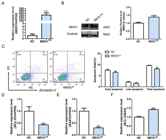 It is well known that sow follicular atresia is trigged by GC apoptosis. We, therefore, examined the role of MEIS1 in the apoptosis of porcine GCs. The expression of MEIS1 in porcine GCs cultured in vitro was significantly over-expressed after transfection with the constructed plasmid pcDNA3.1-MEIS1 (Figure 3A,B). Flow cytometry revealed that overexpression of MEIS1 significantly decreased the total apoptosis rate of GCs, not the early and late apoptosis (Figure 3C). In addition, apoptosis-related genes BCL-2 (Figure 3D) and BAX (Figure 3E) mRNA levels were significantly decreased, and the BCL-2/BAX ratio (Figure 3F) was significantly increased in GCs transfected with pcDNA3.1-MEIS1 compared with the control group. Taken together, these observations above indicate that transcription factor MEIS1 inhibits porcine GC apoptosis.