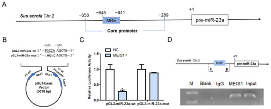 To verify whether MEIS1 is a common transcription factor of both miR-23a and NORHA in pigs, we first investigated the regulatory effect of MEIS1 on the transcriptional activity of the miR-23a core promoter. An MEIS1-binding element (MBE) motif (5′-TGACA-3′) was found at −645 nt~−641 nt of the core promoter of the porcine miR-23a gene (Figure 4A). We next constructed two reporter vectors for miR-23a core promoter containing wild-type (wt) or mutated-type (mut) MBE motif, respectively (Figure 4B), and commonly transfected with MEIS1 overexpression vector pcDNA3.1-MEIS1 into porcine GCs. Luciferase reporter assays showed that the luciferase activity of pGL3-miR-23a-wt, but not pGL3-miR-23a-mut, was significantly decreased by transcription factor MEIS1 in GCs (Figure 4C). ChIP assay further confirmed that MEIS1 was able to bind to the MBE motif in the miR-23a core promoter in porcine GCs (Figure 4D). These data suggest that MEIS1 acts as a transcription factor to repress the transcriptional activity of miR-23a core promoter in porcine GCs.