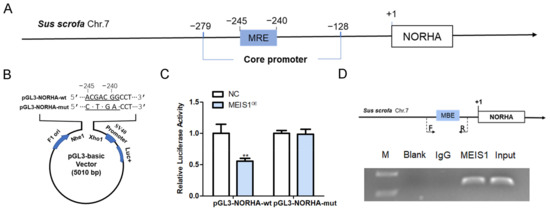 We next verified whether the regulatory effects of transcription factor MEIS1 on the transcriptional activity of the NORHA core promoter. An MBE site (5′-CTGTCA-3′) was discovered at −245 nt~−239 nt of the core promoter of the porcine NORHA gene (Figure 5A). We next constructed two reporter vectors with NORHA core promoter containing MBE-wt and MBE-mut motif (Figure 5B), and commonly transfected with pcDNA3.1-MEIS1 into porcine GCs. The luciferase activity of pGL3-NORHA-wt, but not pGL3-NORHA-mut, was significantly decreased after MEIS1 overexpression in porcine GCs (Figure 5C). ChIP assay further confirmed that transcription factor MEIS1 was able to bind to the MBE motif in the NORHA core promoter in porcine GCs (Figure 5D). These results suggest that MEIS1 acts as a transcription factor and inhibits the transcriptional activity of NORHA core promoter in porcine GCs.