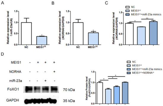 MEIS1 transcriptional represses the miR-23a/NORHA axis in porcine GCs. (A,B) miR-23a (A) and NORHA (B) levels were detected in GCs after transfection with pcDNA3.1-MEIS1 at 48 h. (C) NORHA levels in GCs after common transfection with pcDNA3.1-MEIS1 and miR-23a mimics at 48 h. (D) FoxO1 protein levels in GCs after common transfection with pcDNA3.1-MEIS1 and miR-23a mimics, or pcDNA3.1-NORHA. Data are expressed as the mean ± S.E.M, and significance was tested using a t-test (B) and one-way ANOVA (C,D) (* p < 0.05, ** p < 0.01). NC, negative control.