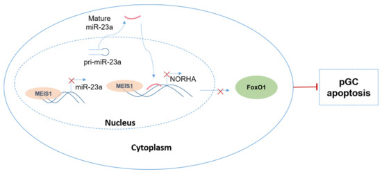 In conclusion, we identified transcription factor MEIS1 as a common transcription repressor of the miR-23a and NORHA axis in GCs. Furthermore, we also defined a novel molecular network composed of a transcription factor MEIS1, a signaling axis miR-23a/NORHA, and an effector molecule FoxO1 to control GC apoptosis (Figure 8). Overall, our findings provide a new insight into the molecular mechanism of follicular atresia, that is, from a single gene, a signal axis, to a regulatory network.
