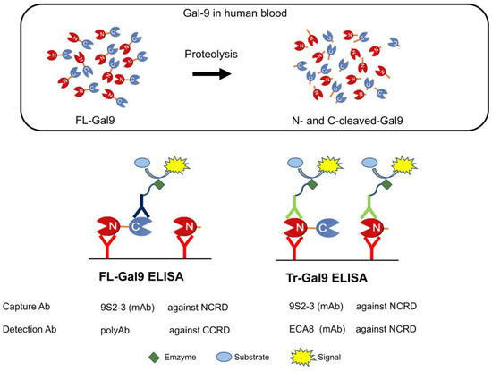 The plasma levels of FL-Gal9 were quantified using FL-Gal-9 ELISA (GalPharma, Takamatsu, Japan), described previously [53]. In this ELISA, 9S2-3 monoclonal antibody (Ab) (GalPharma, Takamatsu, Japan) against NCRD of human Gal-9 and polyclonal Ab (GalPharma, Takamatsu, Japan) against its CCRD were used as the capture and detection antibodies, respectively (Figure 1). The plasma levels of Tr-Gal9 were quantified using Tr-Gal-9 ELISA, which has been previously constructed using both the capture monoclonal Ab, 9S2-3, and detection monoclonal Ab, biotinylated ECA8 (MBL, Nagoya, Japan), against NCRD of human Gal-9 [54]. The N-cleaved-Gal9 levels were calculated by subtracting the concentration measured by FL-Gal9 ELISA from that measured by Tr-Gal9 ELISA.