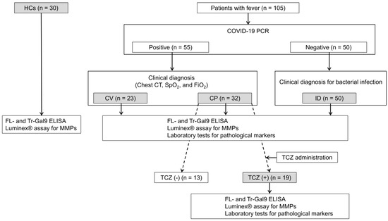 This study was a cross-sectional analytical study. Of 105 patients with fever recruited in Sendai City Hospital (SCH), Sendai, Japan, 62 patients in 2020 were included in our previous study [23], and 43 patients in 2021 were enrolled in our study (Figure 2). We sampled the patients’ EDTA plasma obtained by centrifugation of the peripheral blood at 3000 rpm for 10 min. Among them, 55 patients were diagnosed with COVID-19 by the PCR test for SARS-CoV-2 of a nasopharyngeal sample as previously described [26]. It was assumed that COVID-19 patients in 2020 were mostly infected with the B.1.1.284 variant of SARS-CoV-2, and those in 2021 were infected with the B.1.1.214 variant, followed by the R.1. variant [51]. The remaining PCR-negative 50 patients were clinically diagnosed with bacterial infection (ID). We divided the 55 patients infected with SARS-CoV-2 into two groups: 23 patients with mild clinical symptoms (CV) and 32 patients associated with pneumonia (CP) according to clinical diagnosis based on the symptoms, chest computed tomography (CT), and SpO2 and FiO2 tests. The severity of symptoms in each patient was assessed with reference to the WHO classification as described [52]. Of CP patients, those with severe symptoms being managed in ICU were treated with TCZ in combination with dexamethasone (TCZ (+)). The measurements of plasma FL-Gal9, Tr-Gal9, MMP-2, and MMP-9 and laboratory tests for the specific pathological markers were performed in CV, CP, ID, and TCZ (+) patients. The plasma of 30 healthy controls that were negative for HIV, SARS-CoV-2, and hepatitis B and C viruses were obtained from BioIVT (Hicksville, NY, USA) and subjected to the measurements of plasma FL-Gal9, Tr-Gal9, MMP-2, and MMP-9.