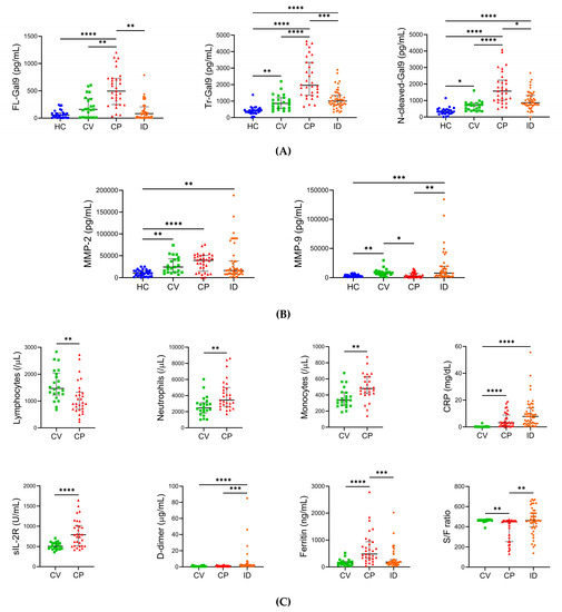 We determined the baseline of plasma Gal-9, MMP-2, and MMP-9 levels and the specific pathological marker levels in healthy controls, CV, CP, and ID at the initial visits. Both FL-Gal9 (495.0 pg/mL, IQR (interquartile range): 247.8–730.8 pg/mL) and Tr-Gal9 (1961 pg/mL, IQR: 1359–3353 pg/mL) levels in CP were significantly higher compared to those in healthy controls, CV, and ID (Figure 3A). Likewise, N-cleaved-Gal9 levels in CP (1570 pg/mL, IQR: 1021–2232 pg/mL) were significantly higher compared to those in CV (698.0 pg/mL, IQR: 402.3–840.2 pg/mL) and ID (866.0 pg/mL, IQR: 727.2–1309 pg/mL) as well as healthy controls (326.1 pg/mL, IQR: 196.5–459.0 pg/mL). Notably, we found more significant differences in Tr-Gal9 and N-cleaved-Gal9 levels (p < 0.0001) between CV and CP compared to those in FL-Gal9 levels (p < 0.01).