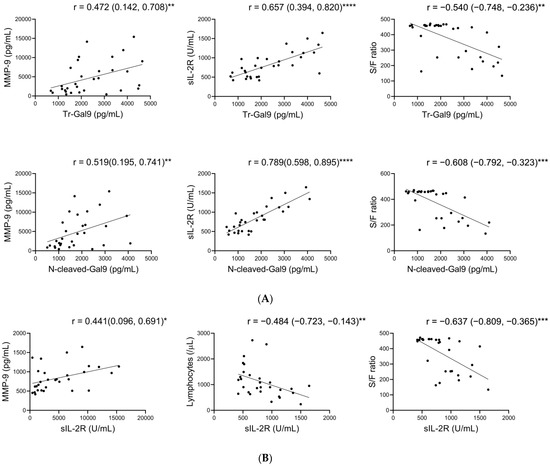 Correlations of Tr-Gal9 and N-cleaved-Gal9 with MMP-9 and specific pathological markers, and those of sIL-2R with MMP-9 and specific pathological markers in COVID-19 with pneumonia (A,B). Scatter plots show Spearman’s rank correlations of (A) plasma Tr-Gal9 and N-cleaved-Gal9 levels with plasma MMP-9 levels, sIL-2R levels, and S/F ratio and (B) sIL-2R levels with plasma MMP-9 levels, lymphocyte counts, and S/F ratio in CP. r: correlation coefficient, ( ): 95% confidence interval (CI), * p < 0.05, ** p < 0.01, *** p < 0.001, **** p < 0.0001.